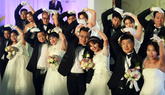 22일 경기 안성시 공도읍 안성팜랜드에서 농협중앙회가 개최한 ‘농촌 다문화가족 어울림 한마당’ 축제에서 다문화 부부 10쌍이 백년해로를 약속하며 하트 모양을 만들어 보이고 있다.