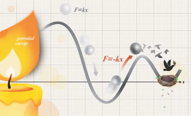 중·고등학교 과학 시간에 여러 번 나오는 스프링 문제가 있다. 물체를 매단 스프링을 가만히 손으로 들고 있어 보라. 위아래로 움직이던 물체는 시간이 지나면 더 이상 움직이지 않고 한곳에 멈추게 된다. 이 위치를 평형위치라 부른다. 평형위치에 있는 물체를 조금 아래로 잡아당겼다 놓으면 물체는 평형위치를 중심으로 위아래로 진동한다. 평형위치를 기준으로 해서(즉, 평형위치를 x=0으로 해서) 잰 물체의 위치를 x라 하면, 이 물체에 작용하는 힘 F는 F=-kx로 적힌다(k는 양의 상수). 이 식의 오른쪽에 음(-)의 부호가 있다는 것이 중요하다. 바로 이 부호 덕분에 만약 x가 양의 값이면 힘은 음의 방향이 되고, 만약 x가 음의 값이면 힘은 거꾸로 양의 방향이 된다. 즉, 물체를 아래로(양의 방향) 당기면 힘은 위로(음의 방향) 작용해서 물체는 처음의 평형위치로 돌아가려 하고, 물체를 위로 올려 스프링의 길이를 줄이면(-) 물체는 거꾸로 아래로(+) 평형위치를 향해 내려가려 한다는 뜻이다. 식 F = -kx에서 힘의 세기가 x에 비례한다는 것도 중요하다.