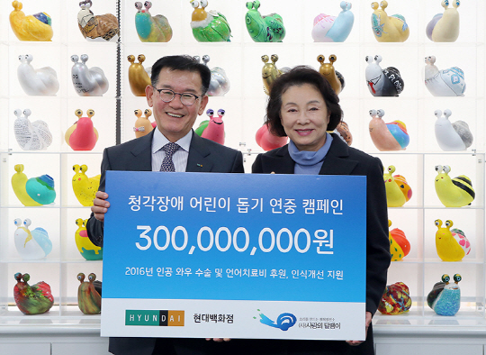 김영태(왼쪽) 현대백화점 사장은 22일 서울 강남구 테헤란로의 청각장애인 후원단체인 사단법인 ‘사랑의 달팽이’를 찾아 김민자 회장에게 청각장애 어린이 돕기 기금으로 3억 원을 전달했다. 현대백화점은 지난 4년간 127명의 청각장애 어린이 치료 비용으로 총 11억 원을 기부했다.