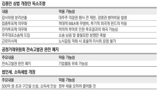 감사위원 선출 때 대주주의 의결권을 3%로 제한하는 감사위원 분리선출은 투기성 외국 자본이 이를 악용하려 들 가능성이 크고, 집중투표·전자투표제의 의무화도 적대적 인수·합병(M&A)을 방어하거나 악의성 루머에 흔들리는 소액주주들에 의해 기업의 의사결정이 혼란을 겪을 수 있다.