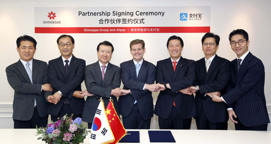 양춘만(왼쪽 첫 번째) 신세계그룹 관리총괄 부사장, 성영목(〃 세 번째) 신세계디에프 사장, 더글라스 피긴(〃 네 번째) 알리페이 글로벌 사장 등이 22일 서울 중구 명동 신세계백화점 본점에서 알리페이와의 마케팅 협력 업무협약을 맺고 기념촬영을 하고 있다. 신세계는 면세점과 백화점이 시작했던 알리페이와의 마케팅 협력 업무협약을 신세계프라퍼티, 이마트, 위드미, 스타벅스커피코리아, 신세계사이먼 등 5개 주요 계열사로 확대해 맺기로 했다. 신세계면세점 제공