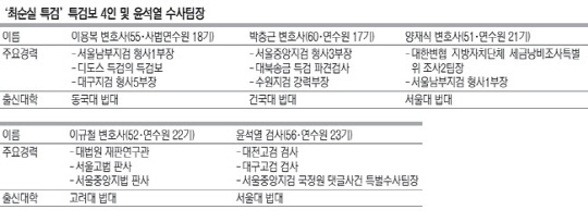 박 특검은 6일 오전 11시쯤 윤석열 검사 등 1차 파견검사 10명과 상견례를 겸한 첫 번째 회의를 열었다. 이 자리에서 박 특검은 향후 특검수사의 방향에 대한 개략적인 설명을 한 것으로 알려졌다. 파견검사의 직무에 대한 논의도 오갔다. 파견검사들은 회의 뒤 곧바로 수사기록 검토에 착수했다. 박 특검은 이날 서울 서초동 법무법인 강남 사무실로 출근하면서 기자들과 만나 “파견검사 10명을 오늘 중으로 추가로 요청할 예정이며 수사기록 사본도 오늘 중 넘겨받을 예정”이라고 밝혔다. 이날부터 특검의 본격적인 수사가 시작되는 셈이다. 4명의 특검보 중 검사 출신 이용복·박충근·양재식 특검보는 대기업 상대 불법모금, 청와대 문건유출, 세월호 7시간 의혹, 김기춘 전 대통령비서실장·우병우 전 청와대 민정수석의 직무유기 의혹 등 수사 분야를 맡을 것으로 보인다. 판사 출신인 이규철 특검보는 공소 유지를 담당할 전망이다. 윤 검사는 파견검사들을 현장에서 지휘하며 수사 방향을 조율하는 역할을 맡는다.