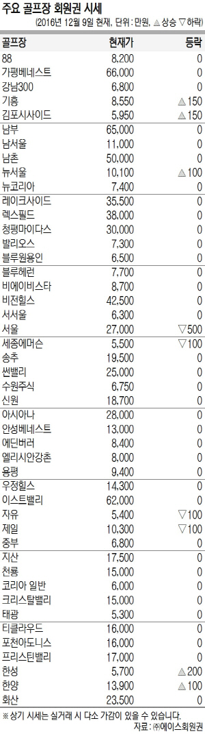 초고가권 중 가평베네스트에 매수 주문이 있지만, 매물이 소진된 상황. 남촌과 렉스필드는 악성 매물이 마무리되면서 보합세를 유지했다. 고가권에선 서울의 시세 하락이 커지고 있지만, 송추는 강보합세로 대조를 이뤘다. 중가권 중 기흥, 뉴서울이 반등에 성공했으나 제일과 자유는 호가 차가 커지면서 약보합세다. 저가권에선 제2영동고속도로 개통 이후 이포의 상승세가 지속하고 있고 덕평, 리베라의 매수세가 늘고 있다.