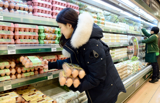 고병원성 조류인플루엔자(AI) 확산으로 달걀값이 치솟는 가운데 12일 서울의 한 대형마트를 방문한 고객이 진열된 달걀 상품의 가격을 심각한 표정으로 비교해 보고 있다.