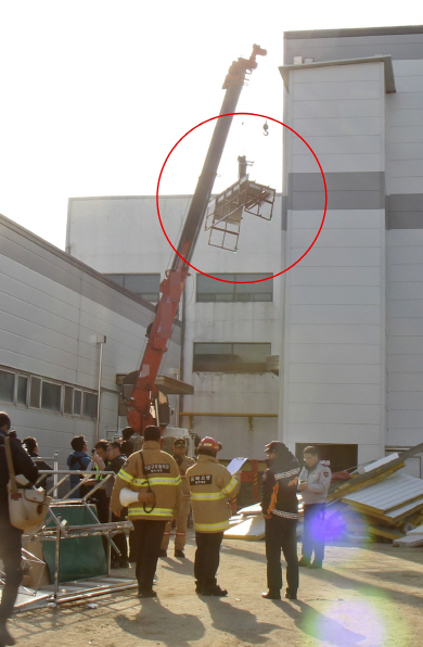 12일 충북 청주시 흥덕구 옥산면의 한 공장에서 크레인 바스켓을 타고 건물 외벽 패널 보강작업을 하던 일용직 인부 4명이 추락해 2명이 사망하는 사고가 발생, 경찰과 119구조대에서 현장조사를 벌이고 있다.