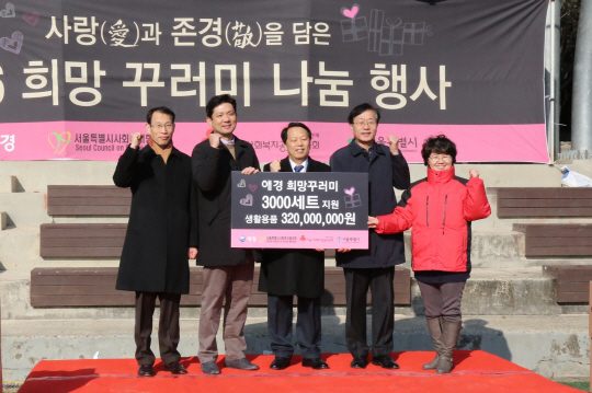 서울시와 애경이 지난 9일 서울 구로구 고척동 고척근린공원에서 개최한 ‘2016 희망꾸러미 나눔’ 행사에서 윤진호(왼쪽 두 번째) 애경산업 상무, 이성(〃 세 번째) 구로구청장 등 관계자들이 기념 촬영을 하고 있다.