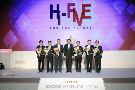 이날 행사에서 이원준(왼쪽 다섯 번째) 롯데백화점 사장이 인종·성별·출신 등에 구애받지 않은 인재 기용에 노력한 공로로 대상을 받았다.