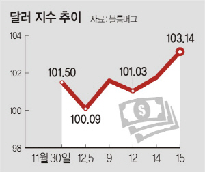 이날 엔과 유로, 파운드 등 6개 주요 통화 대비 달러 가치를 보여주는 달러 지수는 전일 대비 1.38포인트(1.36%) 오른 103.14를 기록했다. 이는 지난 2002년 1월 11일(106.50) 이래 가장 높은 수준이다.