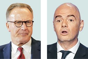 카를 하인츠 루메니게(왼쪽) 유럽프로축구리그협회(ECA) 회장은 16일 오전(한국시간) 영국 BBC와의 인터뷰에서 “유럽 프로축구 일정은 이미 선수들이 감당하기 힘든 수준”이라며 “우리는 FIFA가 월드컵 출전 국가를 늘리는 것에 대해 단호히 반대한다”고 말했다.