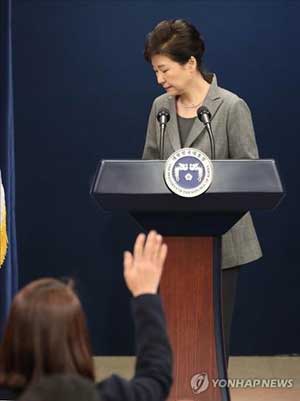 지난 2012년 12월19일 밤 당선이 확정된 직후 “국민께 드린 약속을 반드시 실천하는 민생 대통령이 되겠다”는 첫 각오를 밝혔던 장소인 서울 광화문 광장에서는 8주째 박 대통령의 퇴진을 촉구하는 촛불집회가 이어지고 있다.