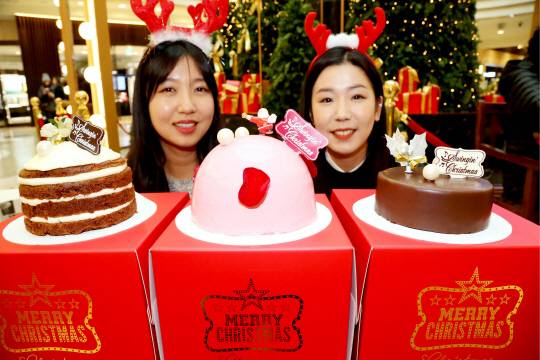 19일 경기 성남시 분당구 AK플라자 분당점 ‘피아짜360’광장 크리스마스트리 앞에서 모델들이 프랑스 정통 베이커리 ‘라롬드뺑’의 신제품 크리스마스 케이크를 선보이고 있다.
