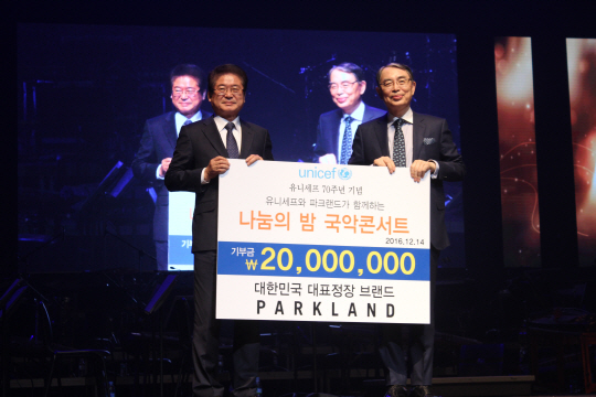 곽국민(왼쪽) 파크랜드 부회장은 지난 14일 부산 해운대구 우동 영화의 전당 하늘연극장에서 열린 부산·영남지역 유니세프 정기후원자, 후원기관 초청 ‘나눔의 밤 국악콘서트’에서 송상현 유니세프한국위원회 회장에게 기부금 2000만 원을 전달했다.