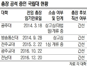 전남대 관계자는 “총장 공석이 장기화되면 정부 지원사업 선정 등에서 불리해질 것”이라고 우려했다. 33개월째 총장 공석 상태인 공주대 관계자도 “대학재정지원사업과 구조개혁평가에서 정성평가의 비중이 갈수록 높아지는 상황에서 총장 부재 장기화로 대학의 미래가 어둡다”고 하소연했다. 방송통신대는 27개월, 전주교대는 23개월, 광주교대는 3개월째 각각 총장 공석 상태로 남아있다. 이들 중 3개 대학의 총장 후보들은 교육부를 상대로 ‘임용 제청 거부 취소 소송’을 제기했다. 공주대·방송통신대는 대법원 판단을 기다리고 있고, 전주교대는 1심 재판이 진행 중이다. 광주 = 정우천