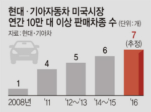 미국시장에서 현대·기아차 7개 차종이 동시에 10만 대 이상 판매를 기록하는 것은 이번이 처음이다. 현대·기아차는 2008년 쏘나타 한 개 차종만 미국에서 10만 대 이상 판매를 기록했으나 이후 2009년 2개, 2010년 3개, 2011년 4개, 2012~2013년 5개, 2014~2015년 6개 등으로 10만 대 클럽 가입 차종을 넓혀 왔다. 1~11월 미국시장 전체 자동차 판매량은 제자리걸음(판매증가율 0%) 했으나 현대·기아차는 차종 다변화 등에 힘입어 2.8% 증가했다.