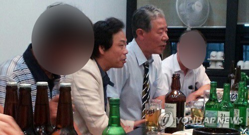 22일 오후 국회에서 열린 박근혜 정부의 최순실 등 민간인에 의한 국정농단 의혹사건 진상규명을 위한 국정조사 5차 청문회에서 더불어민주당 박영선 의원이 공개한 재경 고령향우회 모임 사진. 이 모임에서 특조위원인 새누리당 이완영 의원과 최순실씨의 변호인 이경재 변호사가 나란히 앉아 있다. 2016.12.22 [박영선 의원실 제공=연합뉴스]