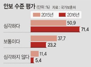 3일 국가보훈처가 실시한 ‘2016년 나라사랑의식지수’ 설문조사 결과에 따르면 우리나라 안보 상황이 ‘심각하다’고 한 응답자는 71.4%로 나타나 국민 10명 중 7명 정도는 한반도 안보에 대해 불안감을 갖고 있는 것으로 분석됐다. 이 같은 결과는 북한의 지난해 1월 6일 4차 핵실험과 9월 9일 5차 핵실험, 잇단 중거리 노동미사일과 잠수함발사탄도미사일(SLBM) 발사 실험 등이 원인인 것으로 파악된다. 이는 2015년 조사에서 ‘심각하다’고 한 응답자가 50.9%였던 것과 비교해 1년 사이 무려 20.5%포인트 증가한 규모다. 보훈처는 여론조사기관 리서치앤리서치에 의뢰해 지난해 10월 24일~11월 1일 만15세 이상 남녀 1000명을 대상으로 전화 설문조사를 진행했다. 조사는 ‘최순실 국정농단 사건’에 따른 국정혼란이 본격화된 시점에 이뤄졌다.