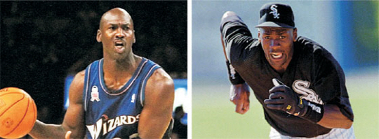가장 대표적인 게 ‘농구황제’ 마이클 조던(54·왼쪽 사진)이다. 조던은 메이저리그에 도전했지만 뚜렷한 성적을 남기지 못했다. 조던은 미국프로농구(NBA) 3번째 우승을 달성한 직후인 1993년 7월 부친이 강도에게 피살되는 사건이 벌어지자 10월 NBA에서 은퇴했다. 조던은 이듬해 메이저리그 시카고 화이트삭스 산하 더블A 구단인 버밍햄 배런스와 계약하고 야구로 전업했다.(오른쪽) 부친의 꿈이 메이저리그 선수가 되는 것이었기 때문.