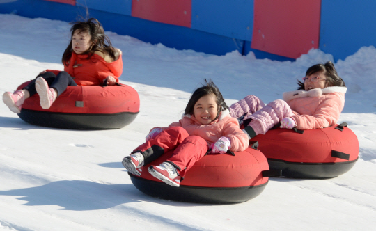 올겨울 최강 추위가 몰아닥친 15일 서울 뚝섬한강공원 눈썰매장을 찾은 어린이들이 고무 튜브 썰매를 타며 즐거워하고 있다.