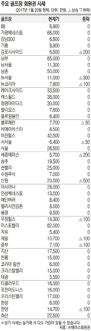 회원권시장의 상승세가 진행 중이다. 경기침체와 정치적인 이슈에 밀려 급락 이후, 저평가 종목들을 중심으로 반등세가 나타나고 있다. 이번 주에는 영남권 종목들까지 급등하면서 관심을 끌었다. 초고가에서는 남부와 이스트밸리의 강보합세가 지속되고 있다. 고가권은 서울을 제외한 송추, 서원밸리가 강보합이고 신원은 매수주문이 누적되며 급등세다. 중가권은 뉴서울과 김포가 강한 상승세를, 은화삼, 중부, 케슬렉스 등도 동반 상승했다. 저가권 중에서는 법정관리 과정에서 회원들 반발이 큰 양지가 하락했으나 리베라는 강세이고 덕평, 솔모로, 한원 등도 매물 부족에 시세가 올랐다.
