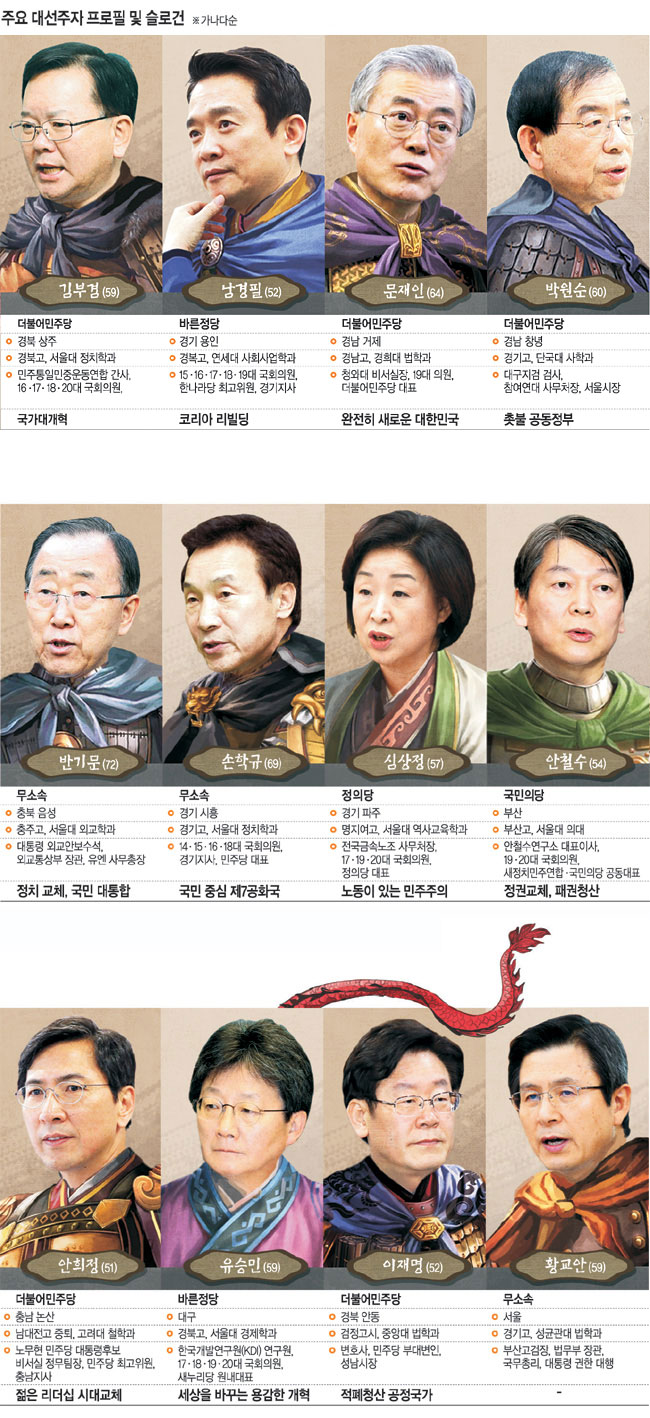 “‘반기문 대통령’은 정권교체가 아니다”는 문 전 대표의 말처럼 민주당 주요 대선주자들은 정권교체와 적폐 청산을 내걸고 선명성을 강화하고 있다. 반 전 총장과 안철수 전 국민의당 공동대표 등이 중도·실용을 내걸고 한판 승부를 벌일 경우 변형된 이념 대결 양상이 펼쳐질 수 있다. 하지만 궁지에 몰린 보수층이 결집을 시도하고, 협치와 연정 등을 주장하는 제3지대의 힘이 빠질 경우 이념적 양 극단이 또다시 정면 충돌하는 양상으로 대선판이 흐를 공산도 배제하기 어렵다.
