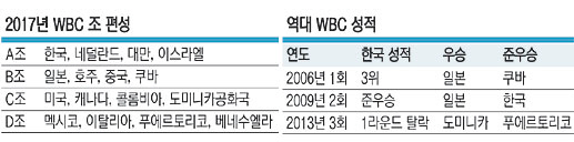 WBC는 준결승까지 1, 2라운드를 거친다. 1라운드는 4개국씩 A∼D조에 편성돼 조별리그를 치른다. 각 조 상위 2개국이 2라운드에 올라 역시 4개국씩 E, F조로 나뉘어 조별리그를 벌이고 각 조 상위 2개국이 4강전에 진출한다. E조 1위-F조 2위, E조 2위-F조 1위가 준결승전을 치러 승자가 결승에서 격돌한다. 한국은 네덜란드, 대만, 이스라엘과 A조에 편성돼 다음 달 6일부터 고척스카이돔에서 10일까지 경쟁한다. B조 경기는 일본 도쿄, C조 미국 마이애미, D조는 멕시코 과달라하라에서 열린다. 2라운드(3월 12∼16일) E조 일정은 도쿄, F조는 미국 샌디에이고에서 치러지며 4강전(21∼22일)과 결승전(23일)은 메이저리그 LA 다저스의 홈구장인 다저스타디움에서 열린다. 한국은 1라운드를 통과할 경우 도쿄에서 일본과 함께 E조에 속해 준결승을 다투게 된다. 1라운드에 이어 2라운드마저 조별리그를 치르는 건 16개국 참가에 그쳐 경기 수를 늘리기 위해서인 것으로 풀이된다.
