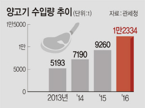 이는 최근 양고기 수입 급증세에 따른 것이다. 양고기 수입은 10년 전인 지난 2007년만 해도 3607t에 불과했다. 하지만 2013년 5193t으로 늘더니 이후 2014년 7190t, 2015년 9260t, 지난해 1만2334t 등 매년 2000∼3000t 규모로 급증했다.