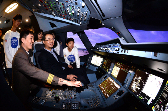 23일 서울 강서구 오쇠동 아시아나항공 운항훈련동에서 열린 A350-900 시뮬레이터 도입식에 참석한 김수천(오른쪽 두 번째) 사장과 경기 고양시 도래울중학교 학생들이 시뮬레이터 체험을 하고 있다.