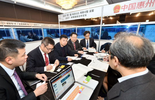 지난 23일 서울 서초구 양재동 더케이호텔 서울에서 열린 ‘한·중 비즈니스 1:1 파트너링 상담회’에 참석한 국내 스타트업(창업 초기 벤처기업) 기술 연구담당자들이 방한한 중국 투자자 및 업인들과 상담하고 있다.