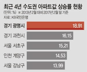 3일 국민은행 부동산시세 2013년 2월∼2017년 2월 기준 아파트값 동향을 분석한 결과, 수도권에서 아파트값이 많이 오른 지역은 서울은 서초구와 강남구, 경기는 광명·과천·안양·군포·안산시 등 서부 벨트로 나타났다. 인천은 계양구와 서구 등의 상승세가 뚜렷했다.
