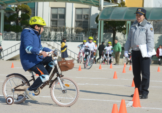 7일 오전 서울 종로구 재동초등학교에서 열린 ‘스쿨존 교통사고 제로 캠페인’에 참가한 어린이들이 안전하게 자전거 타는 방법을 배우고 있다.