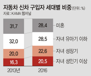 결혼 시기가 갈수록 늦춰지는 추세여서 미혼자 수는 늘고 있지만, 신차 시장에서 차지하는 비중은 오히려 줄었다. 자녀가 아직 없거나 어린 ‘자녀 유아기 이하’ 세대 또한 전체 신차 구입자에서 차지하는 비중이 2013년보다 3.5%포인트 감소한 28.5%에 그쳤다.