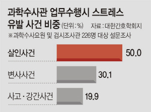 변사 등 외상사건을 수시로 접하는 과학수사(KCSI·Korea Crime Scene Investigation)요원의 20%가량은 ‘외상 후 스트레스 장애(PTSD)’를 겪고 있다는 분석 결과가 나왔다. 15일 대한간호학회지 최근호(2017년 2월)에 게재된 ‘경찰 과학수사요원의 외상 후 스트레스 장애 발생 영향요인(노선미 광주지방경찰청 과학수사계, 김은아 호남대 간호학과)’에 따르면 전국 7개 지방경찰청 과학수사계에 근무 중인 과학수사요원과 검시조사관 중 비례할당방식으로 226명을 설문 조사한 결과 이같이 나타났다.