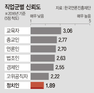 한국인들은 주요 직업군 중 교육자를 가장 신뢰하고, 정치인을 가장 불신하는 것으로 나타났다. 한국언론진흥재단(이사장 김병호)이 최근 발표한 ‘2016 언론수용자 의식조사’ 보고서에 따르면 정치인, 고위공직자, 경제인, 법조인, 언론인, 교육자, 종교인 등 7대 직업군의 신뢰도를 묻는 문항에서 교육자가 가장 높은 점수를, 정치인이 가장 낮은 점수를 받았다.