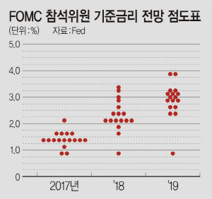 15일(현지시간) Fed는 통화정책결정회의인 연방공개시장회의(FOMC)에서 기준금리를 0.75∼1.00%로 올리면서 올해부터 2019년까지 매년 세 차례씩 금리를 인상한다는 방안을 내놓았다. 이는 Fed가 내놓은 FOMC 참가자들의 기준금리 전망 점도표에 드러난다. 점도표는 FOMC 참가자격이 있는 재닛 옐런 Fed 의장과 스탠리 피셔 부의장, Fed 이사 3명, 12개 지역 연방은행 총재 등 총 17명이 전망하는 기준금리 추이를 보여준다. 점도표에 따르면 기준금리는 올해 앞으로 두 차례 인상을 통해 1.25∼1.50%까지 상승할 것으로 전망된다. 내년에도 세 차례 인상을 통해 2.00∼2.25%로 오르고, 2019년 역시 세 차례 인상으로 3.00%에 다다를 것으로 예상된다. 옐런 의장은 이날 기준금리 인상 발표 후 가진 기자회견에서 “경제가 Fed의 고용 및 물가안정의 목표치를 향해 계속 전진해 왔다”면서 “앞으로 경제가 예상대로 계속 좋아지면 Fed 기준금리를 장기 중립 목표인 3% 수준에 도달할 때까지 점진적으로 올리는 것이 적절할 것”이라고 말했다.