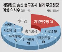 15일 AFP 통신 등에 따르면 네덜란드 여론조사 기관인 입소스가 총선 투표 마감과 함께 발표한 출구조사에서 뤼터 총리가 이끄는 중도 보수의 자유민주당이 31석을 확보하며 제1당을 차지할 것으로 전망됐다. 이어 자유당과 기독민주당, 민주66당이 각 19석, 녹색좌파당이 16석, 사회당은 14석, 노동당은 9석을 확보할 것으로 내다봤다.