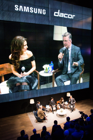 15일(현지시간) 미국 뉴욕 삼성마케팅센터에서 열린 럭셔리 주방가전 브랜드 데이코(지난해 9월 삼성전자가 인수)의 신제품 ‘모더니스트 콜렉션’ 발표회에서 사회를 맡은 영화배우 알렉 볼드윈(맨 오른쪽) 부부가 키친 디자이너, 건축가 등과 함께 제품의 특징을 설명하고 있다.