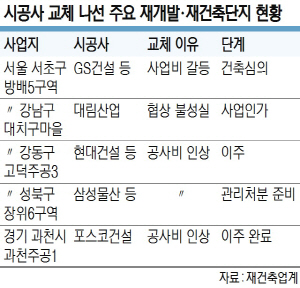 지난 11일에는 강남구 대치동 구마을 제2지구재건축단지조합이 재건축시공권을 대림산업에서 롯데건설로 교체했다. 지난 1월에는 조합원 이주까지 마친 경기 과천시 중앙동 주공1단지 재건축조합이 기존 시공사인 포스코건설과의 시공 계약을 해지했다.