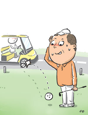 해결 = A는 자신의 볼이 OB 지역으로 빠졌다는 걸 알았으므로 타수와 거리 벌칙에 따라 플레이를 진행해야 했습니다. 만약 자신의 볼이 지나가던 자동차의 도움을 받았다는 사실을 인지하지 못했다면 그에게는 잘못이 없습니다. 하지만 상황이 불확실할 때도 있지요.