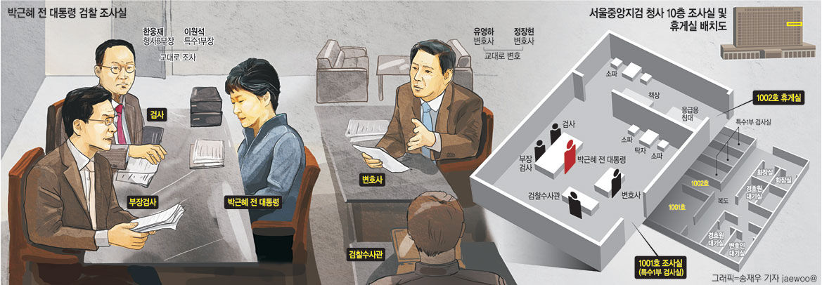 박 전 대통령 측 변호인은 대통령 뒤쪽에 마련된 책상에 따로 자리 잡았다. 유영하(55) 변호사가 먼저 입회했고, 정장현(56) 변호사와 교대해 한 명씩 번갈아가며 들어간 것으로 전해졌다. 입회 변호사 측면에 있는 또 다른 책상에서는 검찰수사관 한 명이 조사 내용을 그 자리에서 타이핑하며 조서를 정리하는 작업을 진행했다. 1001호와 안쪽으로도 연결된 1002호는 박 전 대통령이 조사를 받는 도중 휴식을 취하는 장소로 이용된다. 검찰은 이를 위해 1002호에 응급용 침대도 들여놨다. 1001호와 1002호 복도 바로 맞은편에는 박 전 대통령을 수행하는 경호원들을 위한 대기실 두 곳과 변호사 대기실이 한 곳 마련돼 있다.