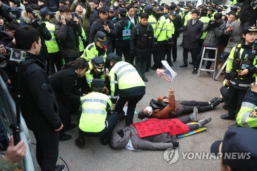 박 전 대통령의 검찰 출석에 반대하는 지지자 3명은 자택 앞 골목에 대자로 드러누웠다가 경찰이 들어 옮겼다. 저항하던 중년 여성 2명은 구급차에 실려갔다.