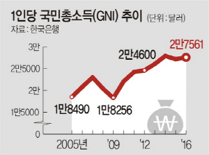 28일 한국은행에 따르면, 지난해 1인당 GNI는 2만7561달러로 전년(2만7171달러)보다 1.4% 늘어나는 데 그쳤다. 우리나라 1인당 GNI는 2006년 처음으로 2만 달러대에 진입하면서 수년 내 3만 달러 달성 기대를 키웠다. 하지만 저성장이 발목을 잡으면서 10년째 2만 달러대에 머물고 있다. 독일과 일본 등이 2만 달러에서 3만 달러로 도약하는 데 5년이 걸린 것과 비교하면 우리나라는 너무 오랫동안 2만 달러대에서 벗어나지 못하는 것이다.