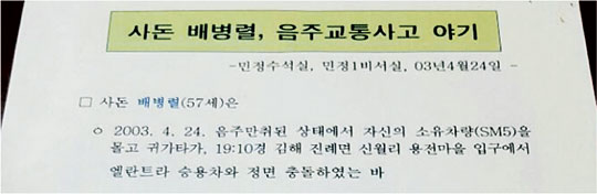 노무현정부 당시 청와대 민정수석실(당시 수석 문재인 더불어민주당 대선 후보)이 노 전 대통령 사돈 배병렬 씨 음주 교통사고의 전모를 사고 당일 파악했을 뿐 아니라 이를 조직적으로 은폐했다는 사실이 문화일보 취재 결과 확인됐다.
