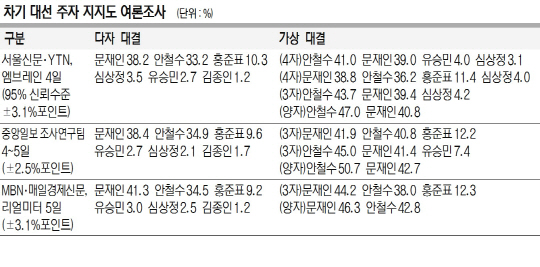 서울신문·YTN이 엠브레인에 의뢰해 4일 벌인 다자대결 조사에서도 문 후보(38.2%)와 안 후보(33.2%)의 격차는 오차범위 내였다. 구도와 크게 상관없이 두 후보가 치열한 접전을 벌이고 있다는 것을 알 수 있다. 이어 홍 후보 10.3%, 심 후보 3.5%, 유 후보 2.7%, 김 전 대표 1.2%였다. 다만 MBN·매일경제신문이 리얼미터에 의뢰해 5일 실시한 조사에서는 문 후보가 41.3%로 안 후보(34.5%)를 오차범위 밖에서 여전히 앞서고 있었다.