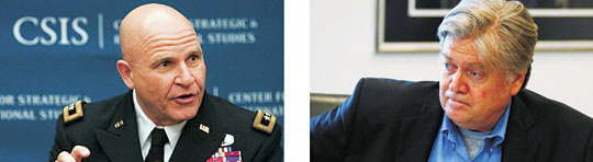 허버트 맥매스터(왼쪽 사진) 미국 백악관 국가안보보좌관이 도널드 트럼프 행정부의 ‘핵심 실세’ 스티브 배넌(오른쪽) 백악관 수석전략가를 국가안보회의(NSC) 상임위원에서 5일 축출하면서 ‘정통파’ 대 ‘아웃사이더’ 대결에서 승리했다.