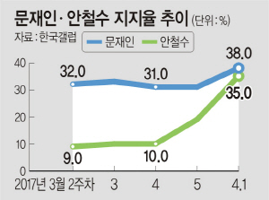 한국갤럽이 7일 발표한 대선주자 지지율 조사에서 문재인 더불어민주당 후보(38%)와 안철수 국민의당 후보(35%)가 오차범위 내 치열한 접전을 벌이는 것으로 나타났다.