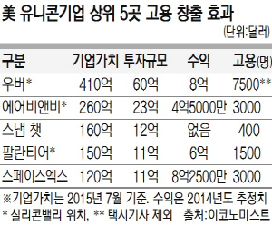 설립한 지 8년밖에 안 된 우버(Uber)는 지난 2015년 7월 기준 410억 달러의 기업가치를 자랑하고 있다. 직원 수만 7500명이다. 미국 내 우버 택시 기사 36만여 명까지 더하면 고용 창출 효과는 더 올라간다. 2008년 스타트업으로 시작한 에어비앤비(Airbnb)의 직원은 3000명에 달한다. 중견기업으로 분류되는 한국 카카오의 직원 수는 지난해 9월 기준 2738명이다. 창업한 지 10년이 채 되지 않는 미국의 유니콘 기업들이 글로벌 기업으로 성장하면서 한국의 중견기업 못지않은 ‘새로운 일자리’를 만들고 있는 것이다.