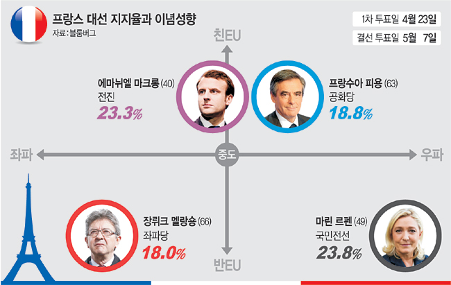 차기 대통령 선출까지 한 달도 남지 않은 시점에서, 현직 대통령의 지지율은 밑바닥이고 집권당 후보는 당선권 밖에 있으며, 1위로 달리던 급진 성향의 대선 후보에 대한 반대 세력 결집으로 ‘중도’후보가 급부상하여 양강 구도를 형성하고 있는 나라. 또, 누가 대선에 승리하느냐에 따라 국제정치에 지각변동이 일어날 수 있기에 주변 국가들이 대선 결과에 신경을 곤두세우고 있는 나라. 한국이 아니라 프랑스의 대선 상황이다. 오는 23일이 대선 1차 투표일인데, 50% 이상 득표자가 없을 땐 1·2위 후보 2명을 놓고 다음 달 7일 결선투표를 치르게 된다.