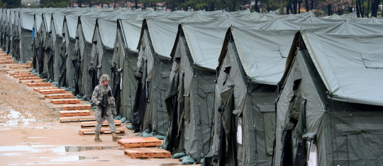 북한의 6차 핵실험과 탄도미사일 발사 위협이 커지고 있는 가운데 미군 병사가 11일 한·미 연합 독수리훈련(FE)에 참가하기 위해 미국 본토에서 파견된 제3원정강습단과 미19지원사 병력 1600여 명의 막사가 늘어선 경북 포항시 해병대 1사단 전투연병장을 걸어가고 있다.