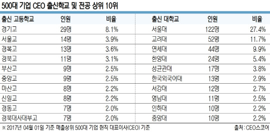 국내 500대 기업 최고경영자(CEO) 중 서울대·연세대·고려대 등 이른바 ‘SKY’ 출신 비율이 다소 줄어들고 한양대·성균관대 출신이 약진한 것으로 나타났다. 전통 명문고로 꼽히는 경기·서울·경복고 출신 비율도 줄어들고 있는 것으로 조사됐다.