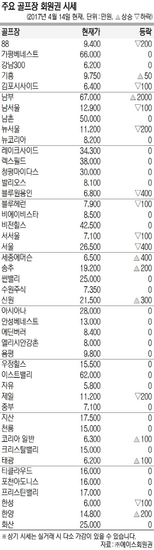 회원권시장의 혼조세가 강화되고 있다. 종목별 등락을 달리하고 있으나 2016년 골프장 매출 급등 소식이 호재로 작용했고 주주제 골프장들에 대한 관심도 증폭되고 있다. 초고가권에선 자산재평가로 재무구조상 안정성을 찾은 남촌에 매수세가 몰리고 있고 남부도 호가가 급등했다. 고가권 중 송추가 매물 기근으로 상승세를 타고 있다. 중가권에선 골드주주와 기흥의 시세가 강보합을 유지하고 있는 가운데 남서울, 뉴서울 등 근교 종목들이 조정국면에 돌입했다. 저가권에선 인천국제가 지속적으로 상승했지만 덕평, 한원 등은 매수세 이탈로 하락 중이다.